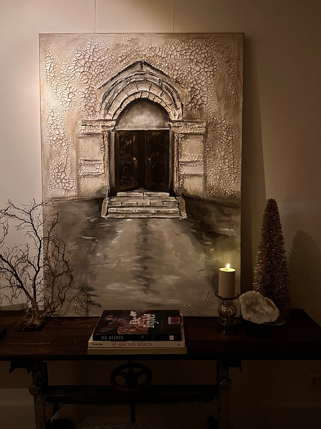 Zodra ik het schilderij zag, werd ik emotioneel. Het schilderij is een weerspiegeling van mijn proces. De gehavende muur/poort en het ongeplaveide pad is het beeld van imperfectie in mijn leven.